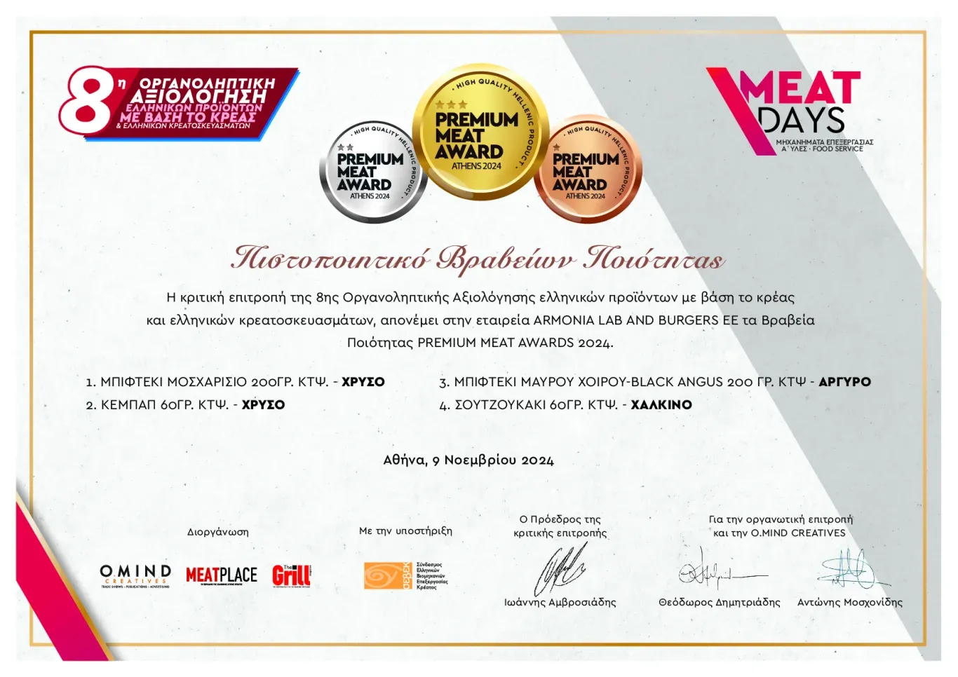 Η Armonia Lab and Burgers E.E. ιδρύθηκε με σκοπό την παραγωγή χειροποίητων παρασκευασμάτων κρέατος υψηλής ποιότητας, με εξειδίκευση στον κιμά. Η αγάπη για το ποιοτικό κρέας και η σκληρή δουλειά μας οδήγησαν στη δημιουργία προϊόντων φτιαγμένων με τα καλύτερα υλικά, τηρώντας αυστηρές προδιαγραφές υγιεινής και ασφάλειας, σύμφωνα με την ελληνική και ευρωπαϊκή νομοθεσία.